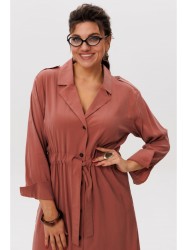 Изысканный английский воротник с лацканами придает платью благородную строгость, а центральная застёжка на пуговицы позволяет варьировать степень открытости, адаптируя наряд к разным ситуациям. Кулиска по линии талии и завязывающийся пояс дают возможность регулировать силуэт – от мягкого полуприлегающего до более выразительного, подчёркивающего талию.