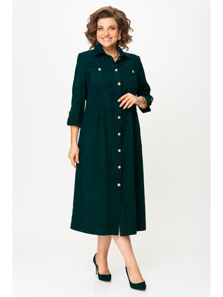 Платье женское полуприлегающего силуэта с втачным рукавом. Застежка на пуговицы на притачных планках. По горловине отложной воротник на отрезной стойке. Верх платья с завышенной талией. По переду накладные карманы. Низ платья – длинная свободная юбка со сборкой из-под верхней части платья и карманами в боковых швах. Рукав длиной 3/4 с отложной манжетой и патой на пуговице.