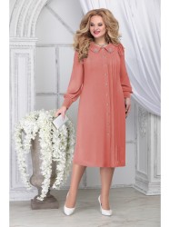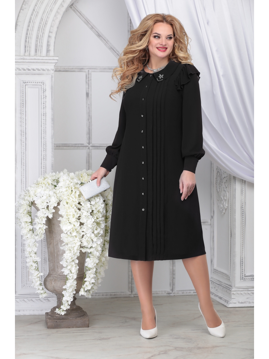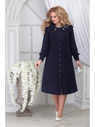 Платье женское, полуприлегающего силуэта, из слегка жатого шифона, чуть расширенное к низу, на подкладке из дышащей, приятной на ощупь и достаточно эластичной ткани. Детали переда асимметричные. Рельефы переда выходят из плечевого шва вниз. На левой средней части зашиты 4 вертикальные складки. Спинка с рельефами, выходящими из плечевого шва вниз. В верхней части рельефом вставлены присборенные рюши. Горловина обтачная, воротник стояче отложной, с заострёнными и вышитыми стеклярусом углами. Застёжка центральная, однобортная, на притачных планках застёжка на 10 вертикальных петель и 10 пуговиц. Рукава втачные, одношовные, с окантованным разрезом, со сборкой по шву притачивания широкой манжеты с застёжкой на 3-и петли и 3-и пуговицы. Изделие с плечевыми накладками.