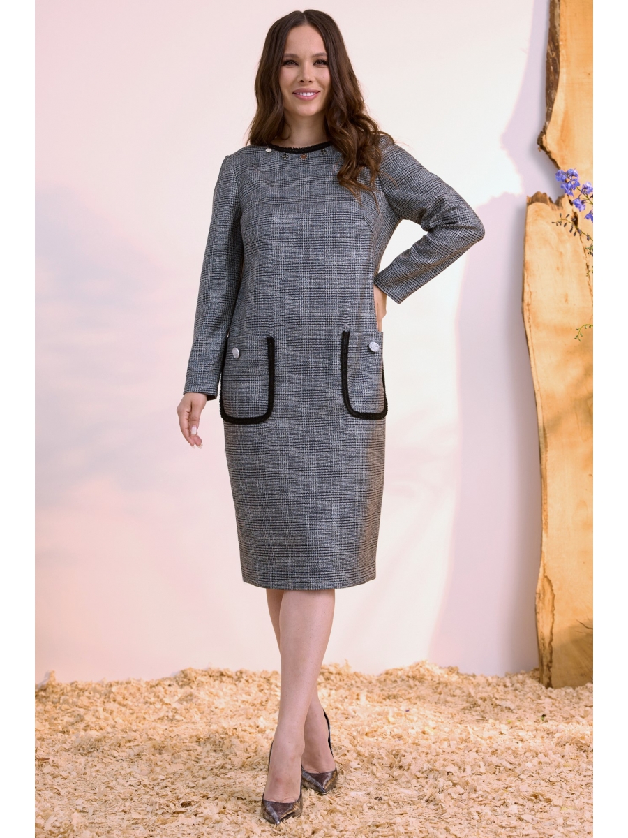 Элегантное платье полуприлегающего силуэта из комфортной костюмной ткани, без подкладки. Рукав длинный, втачной. По спинке застежка на молнию. Горловина с О-образным вырезом. Платье дополнено накладными карманами. Горловина и карманы дополнены красивой декоративной тесьмой. По спинке молния дополнена бархатным бантом.
