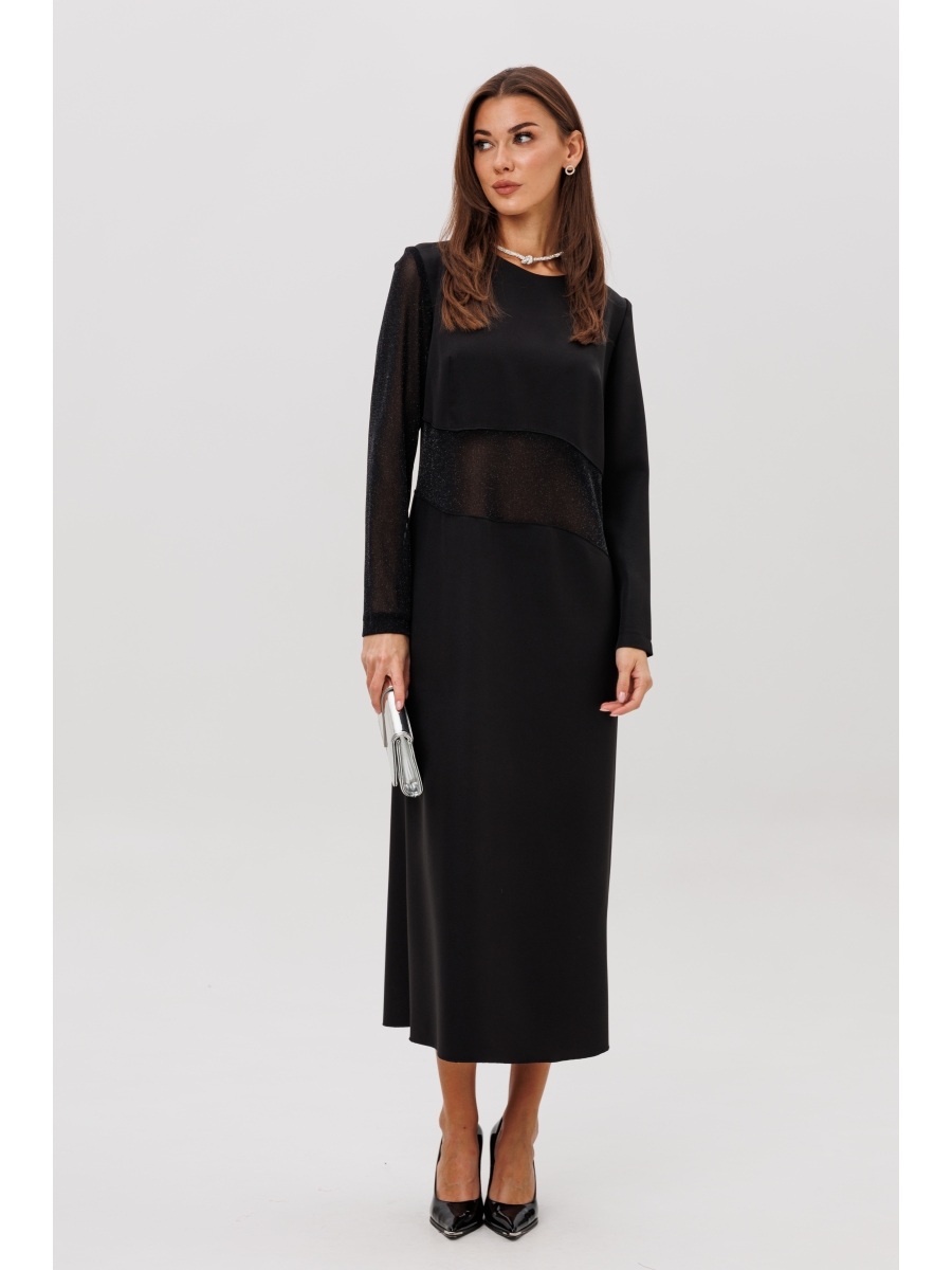 Платье полуприлегающего силуэта изящно подчёркивает фигуру и создаёт утончённый, благородный образ. Втачной крой обеспечивает идеальную посадку, а продуманная длина добавляет элегантности. Главный акцент модели — сочетание разных фактур: полупрозрачный рукав и асимметричная вставка из мерцающей сетки создают лёгкий «вуальный» эффект, добавляя образу загадочности и современного шика.