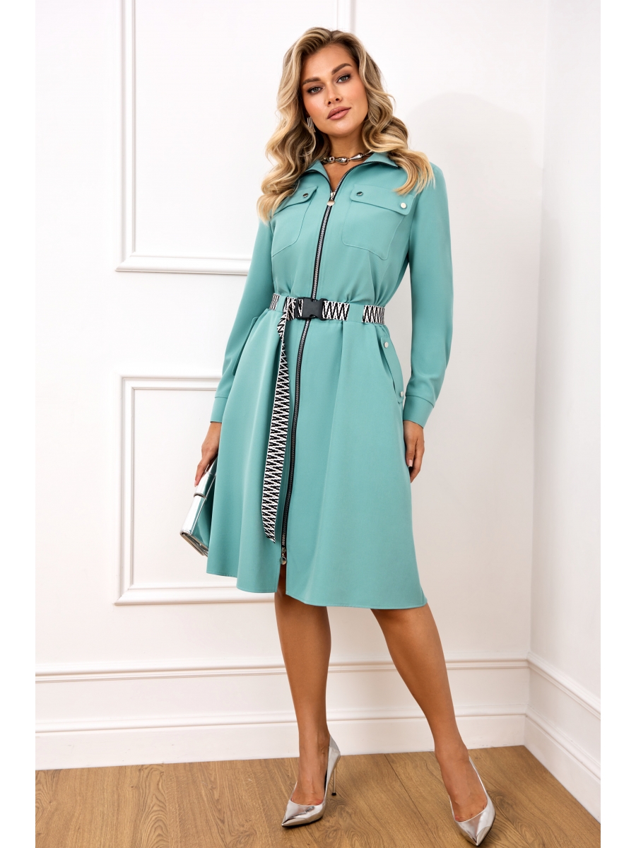 Стильное и элегантное платье выполнено из высококачественной плательной ткани с добавлением хлопка и вискозы. Платье по переду с застежкой на молнию (100 см), накладными карманами и декорировано пришивными пуговицами. По талии платье декорировано съемным поясом (тесьма может отличаться от той, что указана на фотографии) с пряжкой-застежкой и резинкой, что придет модели особый шарм. Рукав платья втачной, с манжетой и застежкой на две пуговицы. Горловина платья с воротником стойкой. Платье без подкладки.