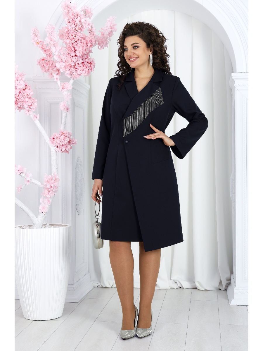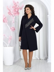 Платье женское, на запах, полуприлегающего силуэта, выполнено из костюмно-плательной ткани. Модель на трикотажной подкладке, с плечевыми накладками. На правой части переда обработан рельеф, направленный от проймы до низа; на левой – фигурный рельеф, направленный от проймы вертикально вниз к линии бедер, затем под острым углом к боковому шву. Левый (верхний) борт удлинен, выступает углом относительно общей линии низа платья и застегивается на 2 петли и 2 декоративные пуговицы. Правый (внутренний) борт доходит до левого бокового шва и пристегивается к нему на 1 потайную пуговицу. Спинка со средним швом и рельефами, направленными от пройм до низа. Воротник пиджачного типа; левый лацкан декорирован тесьмой с бахромой, выполненной в виде нитей из металлических бусинок. Рукав длинный, втачной. Длина платья (по середине спинки) - 100 см, длина рукава - 60 см