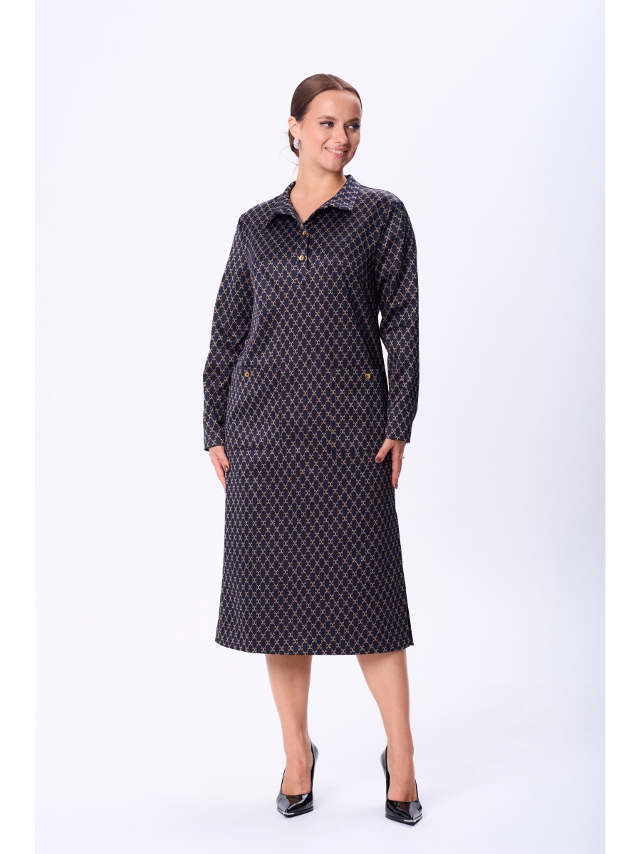 Платье женское прямого силуэта из трикотажного полотна. По переду центральная застежка на петли и пуговицы с воротником в стиле поло, нагрудные вытачки от бокового шва, на уровне линии бедер накладные карманы. Спинка цельная. Рукав одношовный длинный втачного покроя. В боков шве слева разрез.