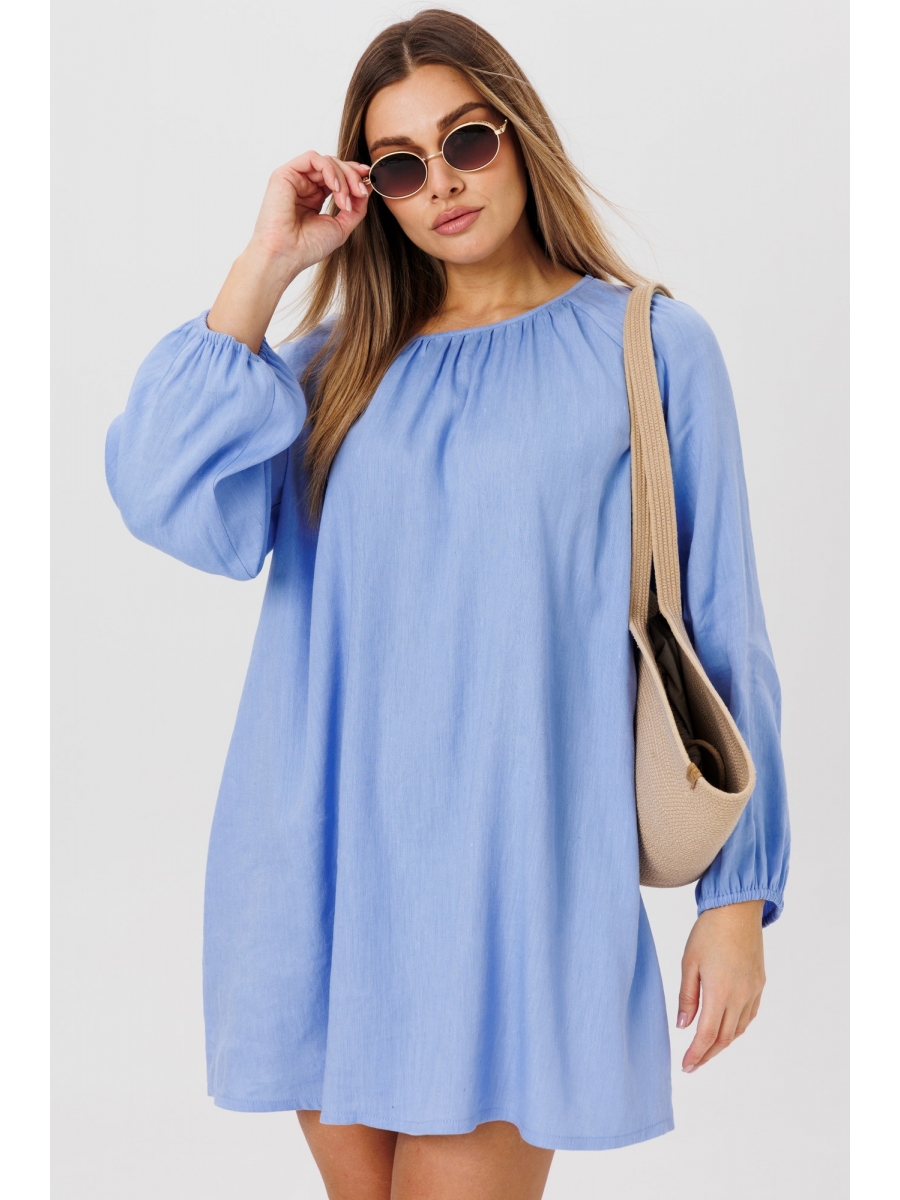 Свободное льняное платье AMIE длиной мини. Горловина платья округлой формы со сборкой, обработана окантовкой. Перед и спинка цельные. Рукав реглан, длинный, снизу собран на резинку. В боковых швах функциональные карманы.