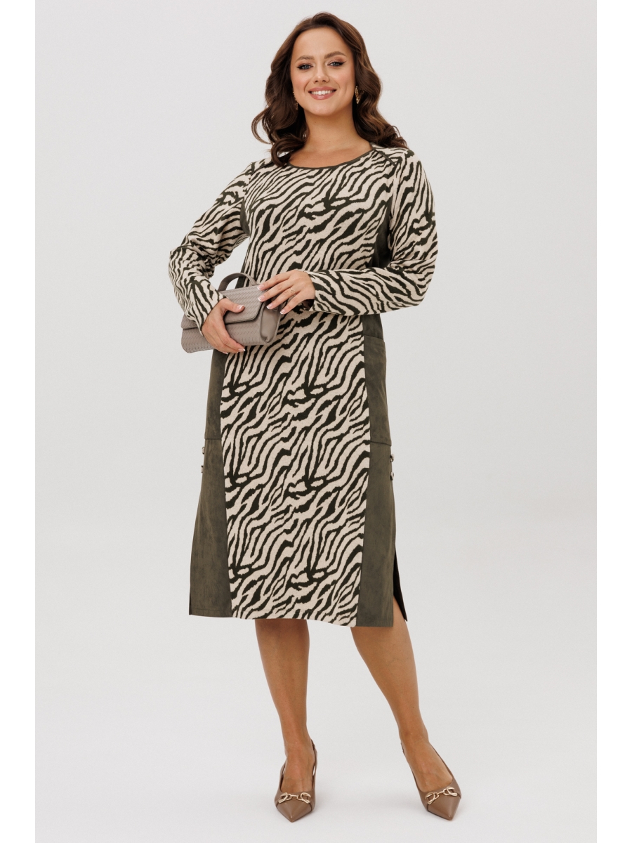 Оформить заказ →Платье женское полуприлегающего силуэта, выполненное из двух видов ткани: мягкого трикотажного полотна с принтом «Зебра» и плательной ткани «Замша», которые немного тянутся. По переду и спинке отрезной бочок, накладной карман. По боковым швам низ платья со шлицами и отделочными пуговицами. По спинке средний шов. Горловина переда – «Лодочка», по спинке – округлая, переходящая в линию кокетки. Срезы горловины обработаны отделочными кантами. Рукава втачные, одношовные. Платье без подкладки.