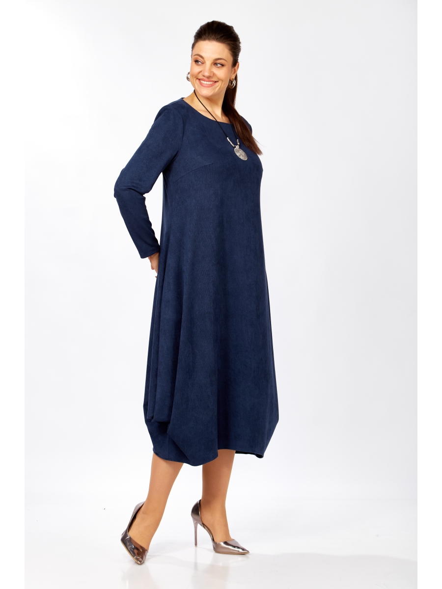Базовое элегантное платье расширенного силуэта в стиле «бохо» с ассиметричным подолом. Модель выполнена из тонкой трикотажной ткани синего оттенка, свободно струящейся по фигуре, создавая утонченный силуэт. Длиные рукава и длина миди делают его идеальным для повседневной носки. Вырез горловины округлой формы у боковых швов со складками. Платье дополнено поясом, что позволяет регулировать ширину по линии талии.