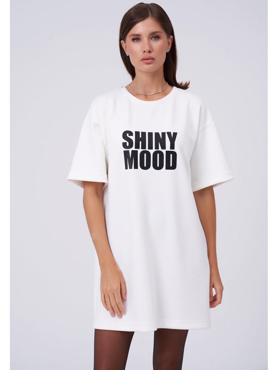 Оформить заказ →Платье-футболка из мягкого трикотажа с ярким, блестящим принтом «shiny mood» (блестящее настроение). Платье прямого силуэта со спущенным рукавом.