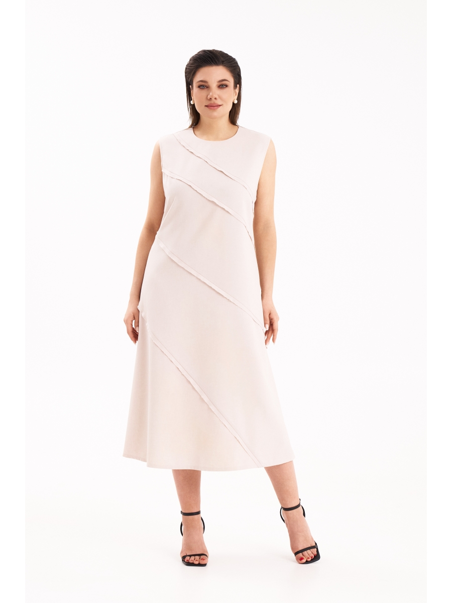 Платье А-образного силуэта длиной миди. Линия плеча слегка спущена, по переду идут диагональные подрезы с вставкой из косой бейки из основной ткани. Спинка слегка приталена вытачками. Застёжка на потайную молнию сзади.