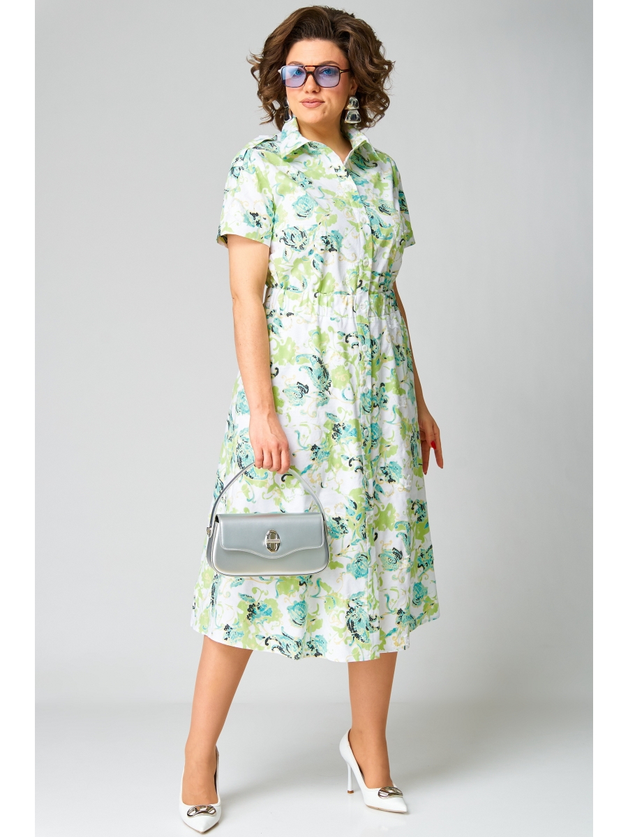 Платье полуприлегающего силуэта, расклешенное книзу. Воротник отложной, на притачной стойке. Платье отрезное по линии талии, на широкой резинке. Платье с центральной застежкой на петли и пуговицы на притачных планках. Полочка с нагрудными вытачками. В боковых швах юбки функциональные карманы. Рукав втачной короткий с широкой декоративной патой, понизу — притачная манжета.