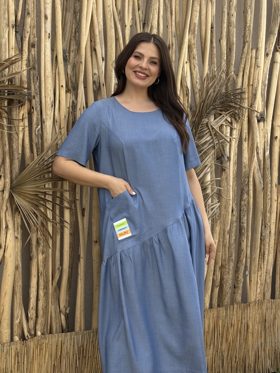 Свободное легкое женское платье из текстильной ткани. Идеальный вариант в жаркую погоду для офиса, прогулки или праздничного выхода. Достаточно обыграть его подходящими аксессуарами и обувью. Платье прямого силуэта, с отрезным косым воланом, со сборкой. Объём по груди создается за счет выточек из проймы. Платье подойдет на любую фигуру, сроет все недостатки. По переду идет накладной карман с нашивкой.