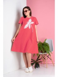 Платье женское трапециевидного силуэта. На детали переда выполнены: декоративная вышивка в виде стрекозы; рельефы, от рельефов вытачки. По спинке выполнен средний шов, в верхней части которого расположен разрез, застегивающийся на навесную петлю и пуговицу. Также выполнены рельефы. Горловина округлая. Рукав короткий.