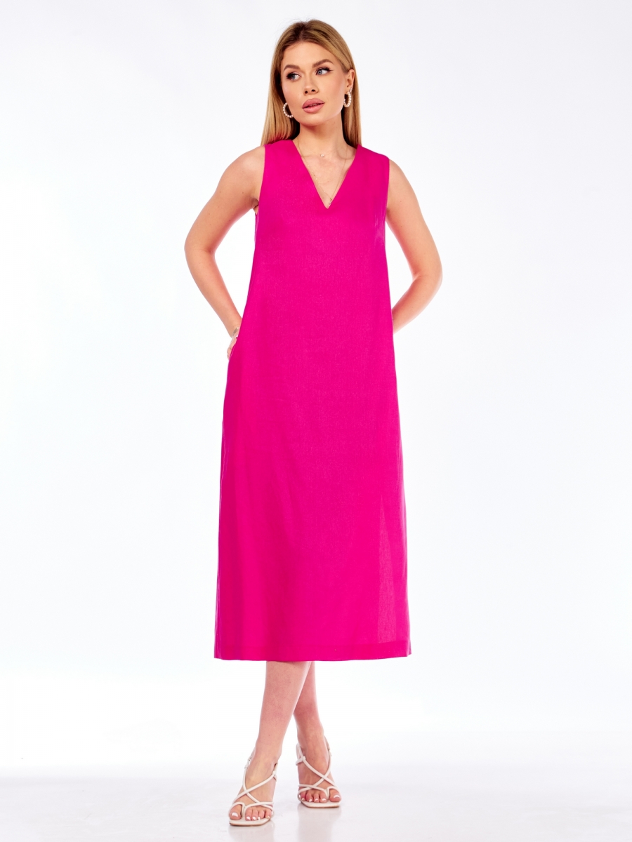 Платье чуть расширенного к низу силуэта, по переду и спинке V-образный вырез горловины. Фиксация ширины спинки на завязку-пояс. Платье с карманами и разрезами по низу.