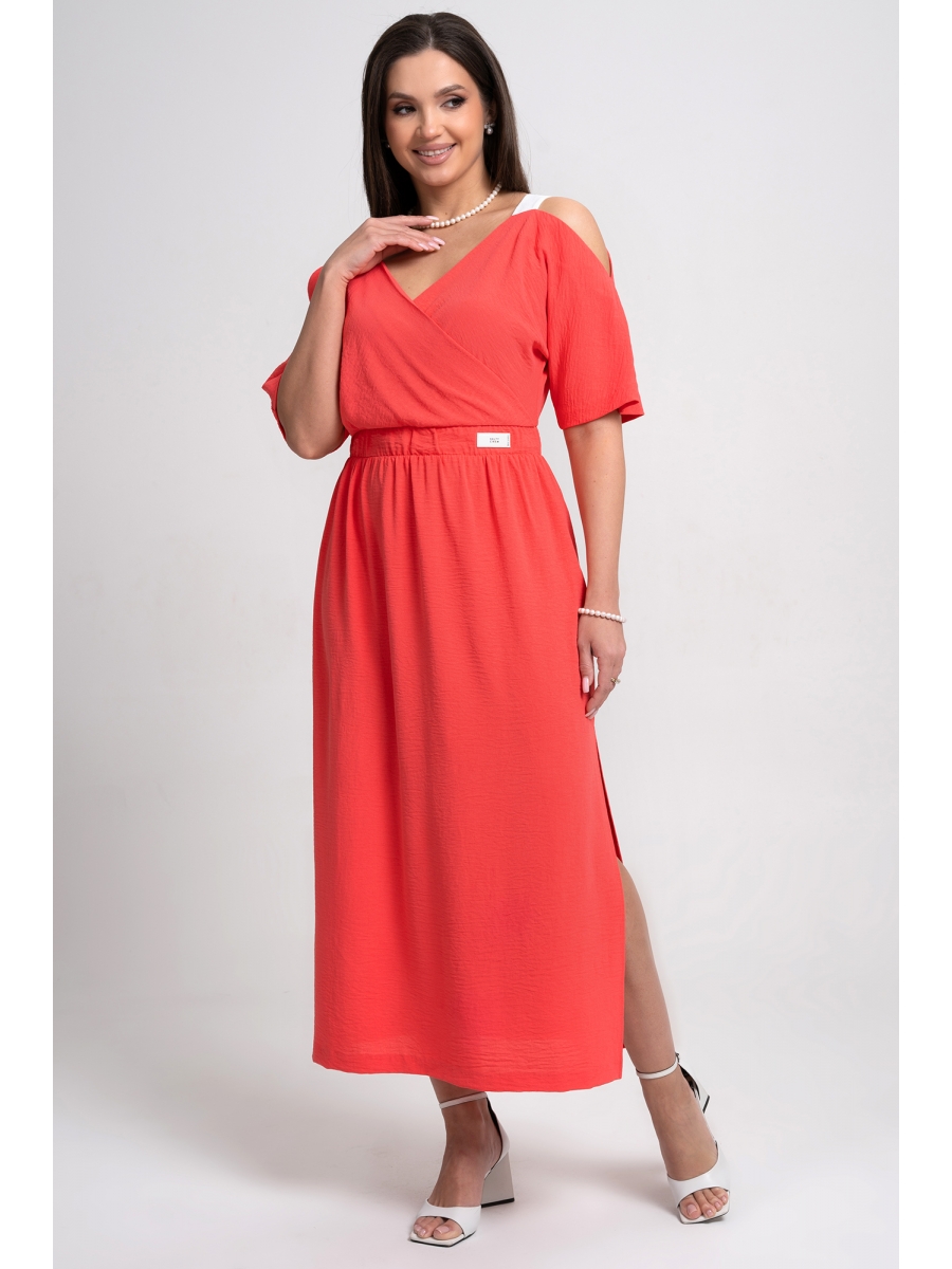Платье прямого силуэта, отрезное по линии талии с поясом на резинке, на широких бретелях (выполнены из отделочной ткани), с открытым плечевым поясом, с цельнокроеными короткими рукавами, по левому боковому разрез. Перед вверху на запах. Спинка со средним швом. Нижняя часть по линии талии дополнительно с небольшой сборкой.