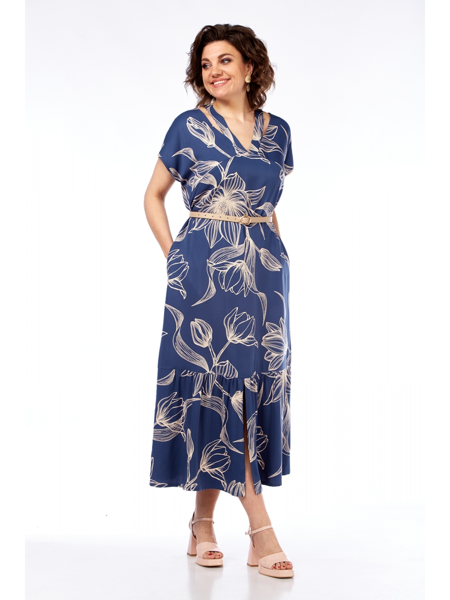 Платье женское, повседневное свободного силуэта, выполнено из легкой, натуральной ткани. Горловина V-образной формы с симметричными вырезами и планками. Перед с кокетками переходящими в цельнокроеные рукава, спинка с кокеткой и фигурным вырезом. По низу платья широкая оборка с разрезом по центру переда. В боковых швах обработаны карманы. Платье дополнено съемным ремнем.