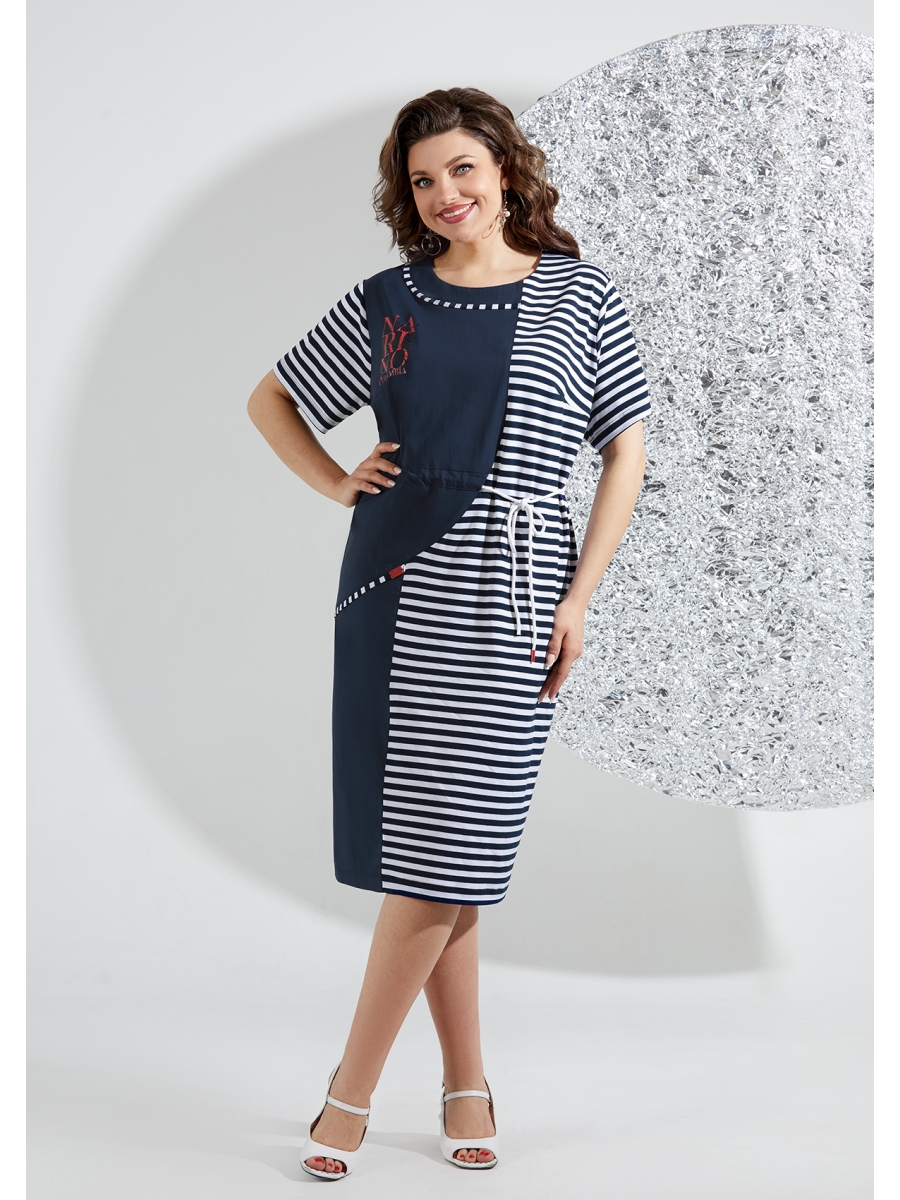 Летнее платье полу-прилегающего силуэта, выполнено из вискозы в полоску и хлопковой ткани. Горловина платья округлой формы, на широкой обтачке с отделкой кантом в полоску. На полочке выполнены ассиметричные подрезы, по одной стороне полочка из вискозы в полоску, другая сторона из хлопкового однотона. По линии талии обработана кулиса с шнуром, по нижней части юбки выполнен еще один декоративный подрез с отделкой кантом. Рукав втачной, укороченный, из вискозы в полоску. Спинка из однотонного хлопка, со средним швом и вытачками. На лифе по стороне выполненной из однотонного хлопка выполнена термо-аппликация контрастного цвета.