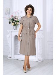 Платье женское приталенного силуэта, выполнено из вискозного полотна. Модель без подкладки, без плечевых накладок. По линии талии спинки и переда -- отрезной пояс с широкой эластичной лентой внутри; по середине пояса прострочена отделочная строчка. Перед с внешней застежкой на 8 петель и 8 пуговиц; по линии талии – дополнительная внутренняя застежка на 1 пуговицу. В верхней и нижней части переда настрочены фигурные накладные карманы с бантовой складкой посередине и клапаны, застегивающиеся на 1 петлю и 1 пуговицу. Горловина оформлена отложным воротником на отрезной стойке. Рукав короткий, реглан; дополнен патой, зафиксированной на плечевом шве двумя шлевками и пуговицей. Длина платья – 110 см; длина рукава (от горловины) – 32 см.
