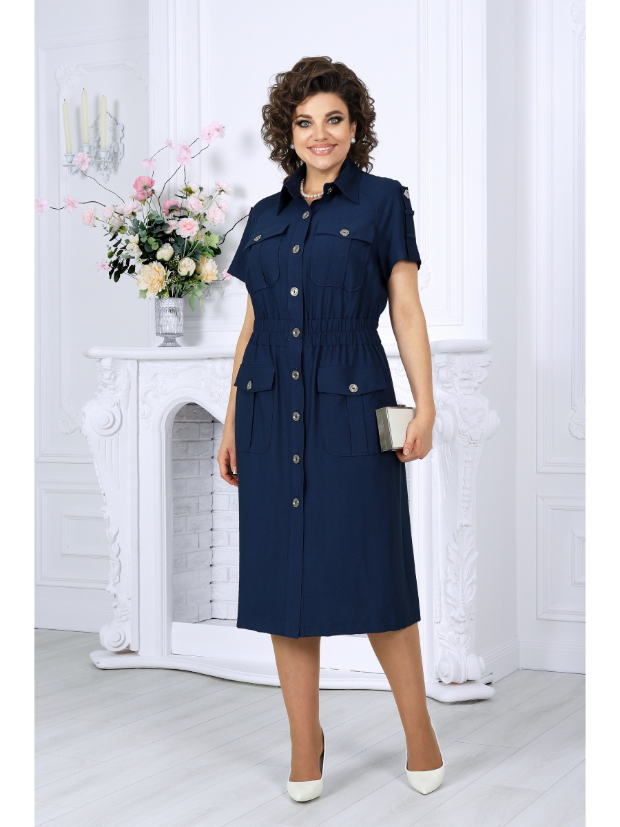 Платье женское приталенного силуэта, выполнено из вискозного полотна. Модель без подкладки, без плечевых накладок. По линии талии спинки и переда -- отрезной пояс с широкой эластичной лентой внутри; по середине пояса прострочена отделочная строчка. Перед с внешней застежкой на 8 петель и 8 пуговиц; по линии талии – дополнительная внутренняя застежка на 1 пуговицу. В верхней и нижней части переда настрочены фигурные накладные карманы с бантовой складкой посередине и клапаны, застегивающиеся на 1 петлю и 1 пуговицу. Горловина оформлена отложным воротником на отрезной стойке. Рукав короткий, реглан; дополнен патой, зафиксированной на плечевом шве двумя шлевками и пуговицей. Длина платья – 110 см; длина рукава (от горловины) – 32 см.