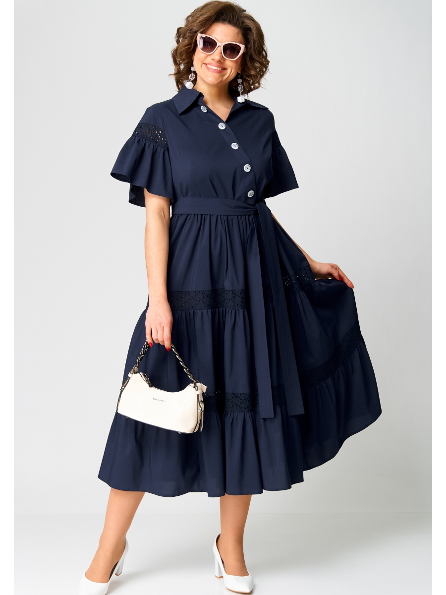 Платье женское нарядно-повседневное полуприлегающего силуэта до талии, расширенное к низу за счет воланов, выполнено из хлопка в сочетании с отделкой из шитья в цвет основной ткани. Вырез горловины воротник на стойке рубашечного типа, рукав втачной по низу с притачным воланом со сборкой и вставкой из шитья. По переду платья ассиметричная планка с имитацией застежки.