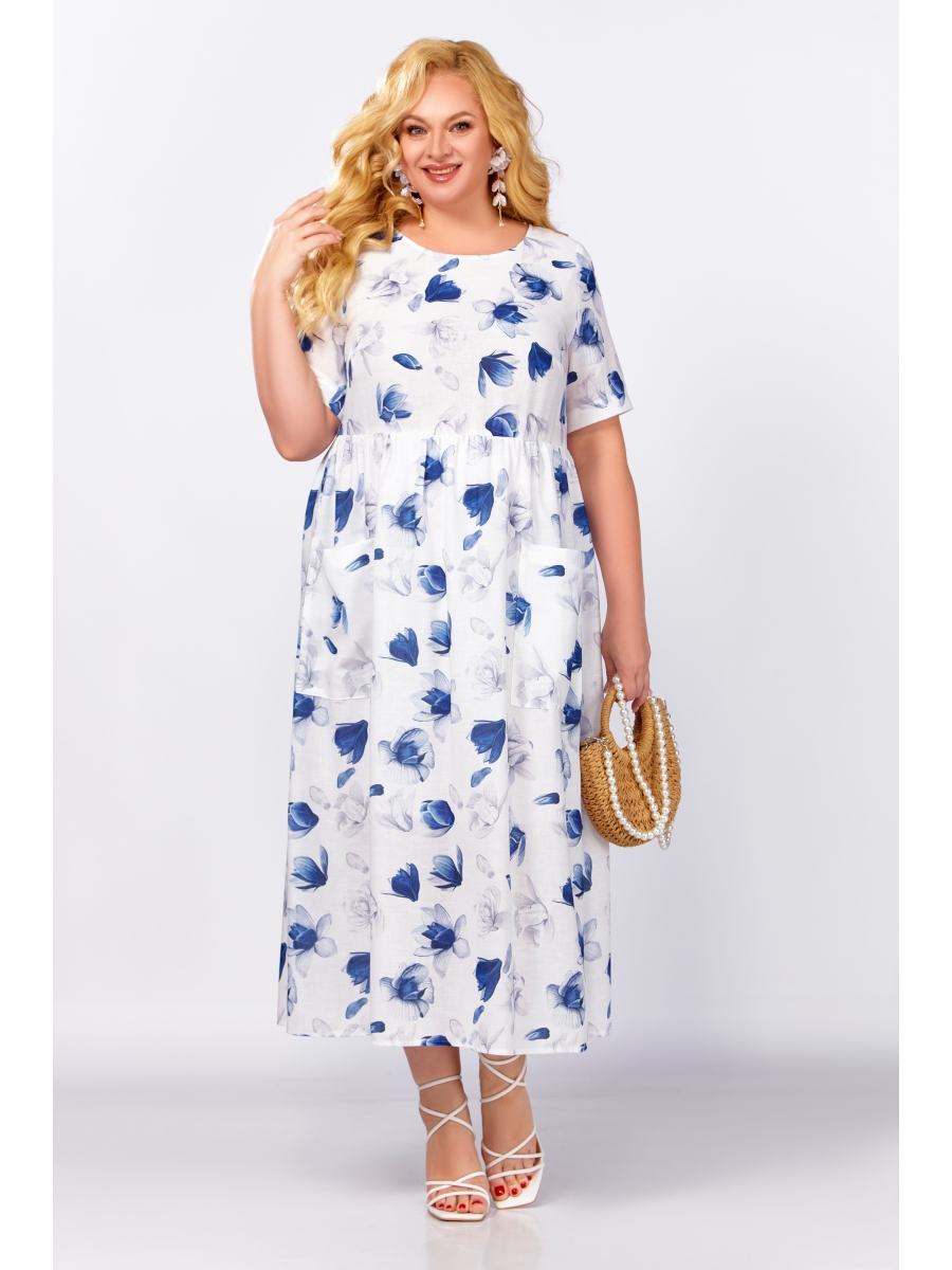 Платье из вискозно-льняной ткани с оригинальным принтом прямого силуэта длиной миди. Платье с отрезной, слегка завышенной линией талии и сборкой по юбке. Лиф полочки с нагрудными выточками и округлым вырезом горловины, лиф спинки с центральным швом и V-образным вырезом горловины. Юбка состоит из передней и задней деталей с цельнокроенными планками по бокам, которые скреплены декоративными пуговицами. На передней детали юбки настрочены накладные карманы. Рукав втачной, короткий.