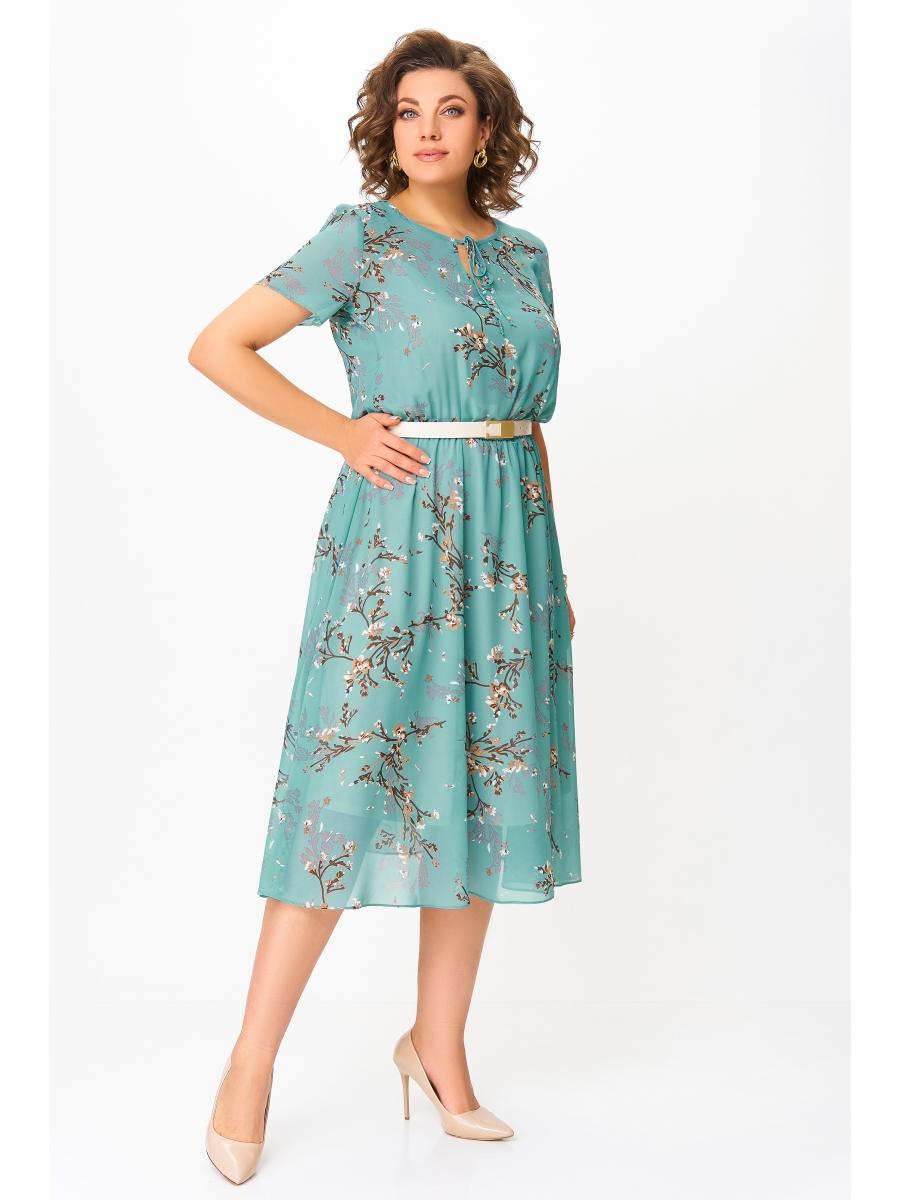 Платье из мягкой шифоновой ткани, на трикотажной подкладке, отрезное по линии талии, шов собран на эластичную тесьму-резинку. Горловина округлой формы, по переду капелька с завязкой. Рукав втачной, короткий. Юбка расклешённая. Подкладка лифа платья на бретелях.