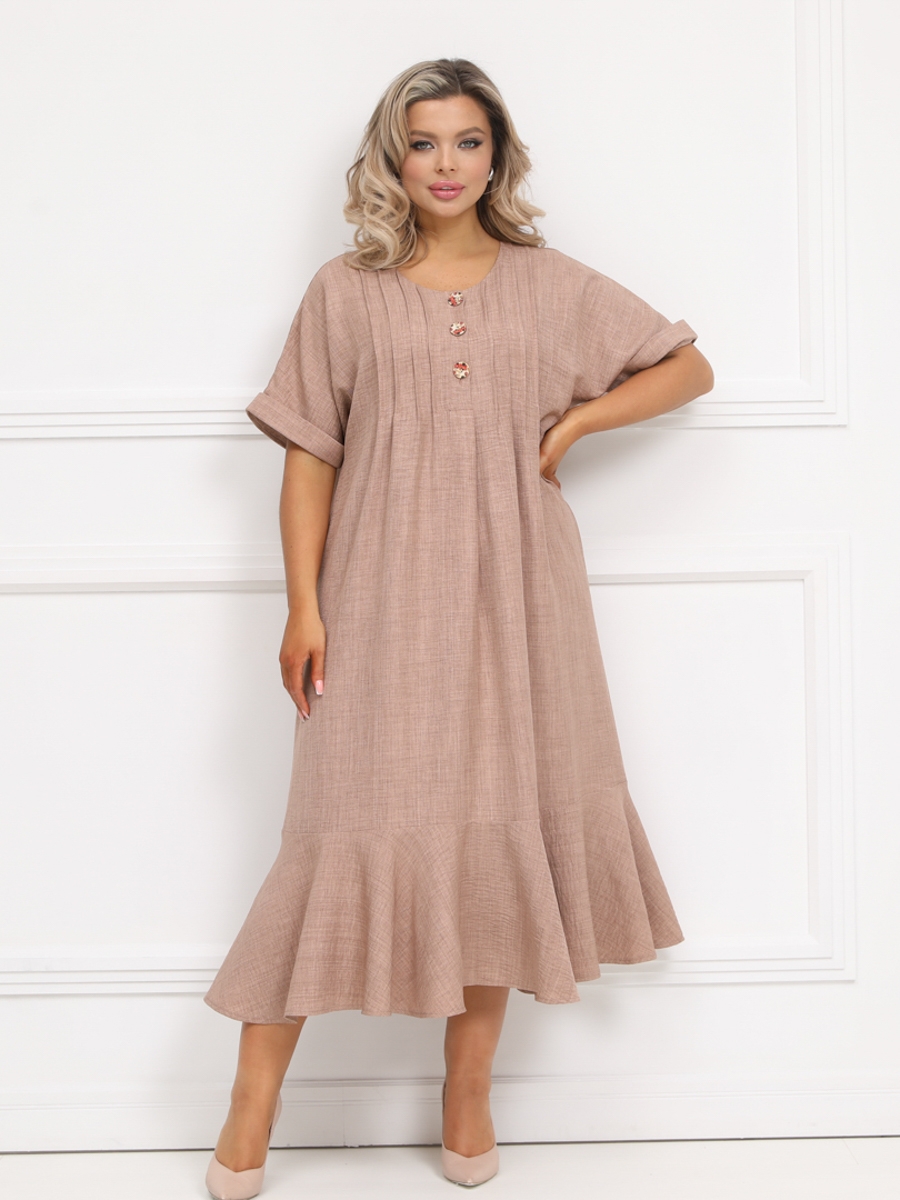 Стильное платье полуприлегающего силуэта из текстильной ткани бежевого цвета. Круглый вырез изделия обработан внутренней обтачкой. Цельнокроеные рукава дополнены отворотами. Кокетка переда дополнена планкой с застежкой на пуговицы и декоративными отстрочками. По бокам изделия - внутренние карманы. По низу изделия - широкая оборка. Ремень в комплект не входит. Длина изделия по спинке от плечевого шва до низа изделия - см. Рост фотомодели - 170 см.