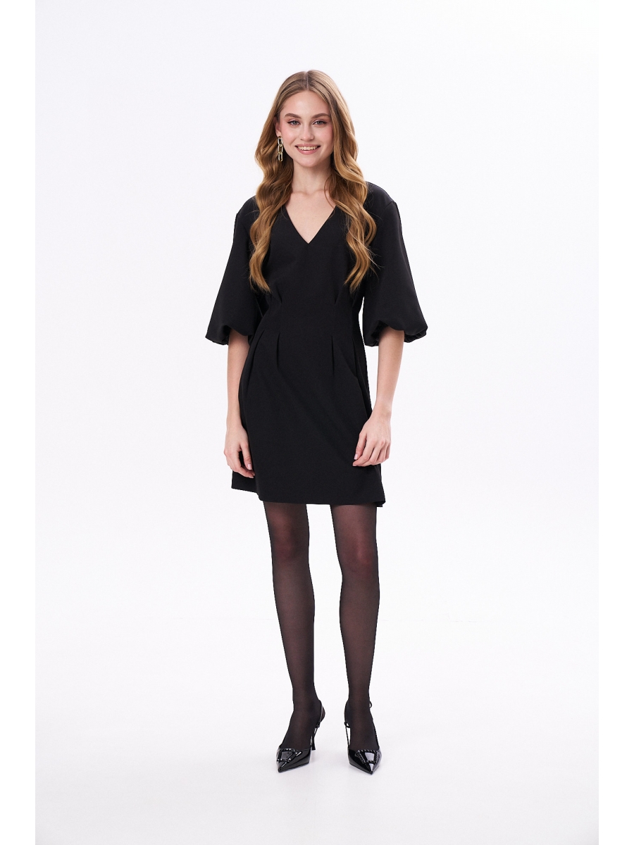 Платье со спущенной линией плеча и пышным рукавом-фонариком, приталенное с застроченными складками в области талии по переду и с вытачками по спине, юбка расклешенная. Вырез горловины V-образный. Застежка на потайную молнию сзади.