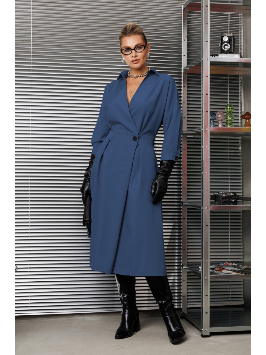 Элегантное женское платье из костюмной ткани необычного кроя станет изюминкой вашего гардероба. Платье полуприлегающего силуэта, отрезное по линии талии со спущенным плечом. Рукав 3/4 длинный на отрезной манжете. По полочке идут защипы-складки в верхней и нижней частях, запах - на петли и пуговицы по подрезу. По нижней части платья запах идет в виде складки. По спинке кокетка со складкой, по подрезу вставлена резинка. Юбка-полусолнце с односторонними складками по полочке, по бокам карманы. По горловине воротник на отрезной стойке.