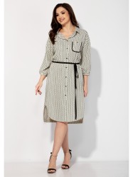 Платье женское, прямого силуэта с рукавом длинной 3/4. Рукав со спущенной линией плеча, снизу на резинке. Воротник рубашечный, на стойке. Застежка центральная, с отрезной планкой, на петли и пуговицы. По спинке кокетка и небольшая сборка по центру из под кокетки. Карманы в боковых швах. На левой полочке карман с отделочной бейкой и пуговицей. По низу боковые разрезы, спереди закругленной формы. Талия акцентирована съемным узким поясом, из отделочной ткани.