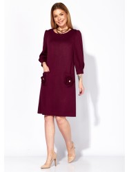 Платье женское, А силуэта, с рукавом длинной 3/4. Рукав втачной, со сборкой по окату, и мягкими складками по низу. По переду нагрудные вытачки. Вырез горловины круглой формы. Карманы накладные, акцентированы стилизированным цветком с декором. По спинке средний шов с отделочной нашивкой сверху.