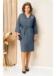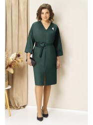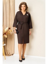 Элегантное лаконичное платье из эластичного трикотажа прямого полуприлегающего силуэта с акцентной V-образной горловиной. Центральный элемент отделки платья - вставки из кожи и необычная съемная брошь для легкости образа. Длина платья немного за колено, уместная в большинстве ситуаций. Спереди небольшой вырез для максимального удобства.