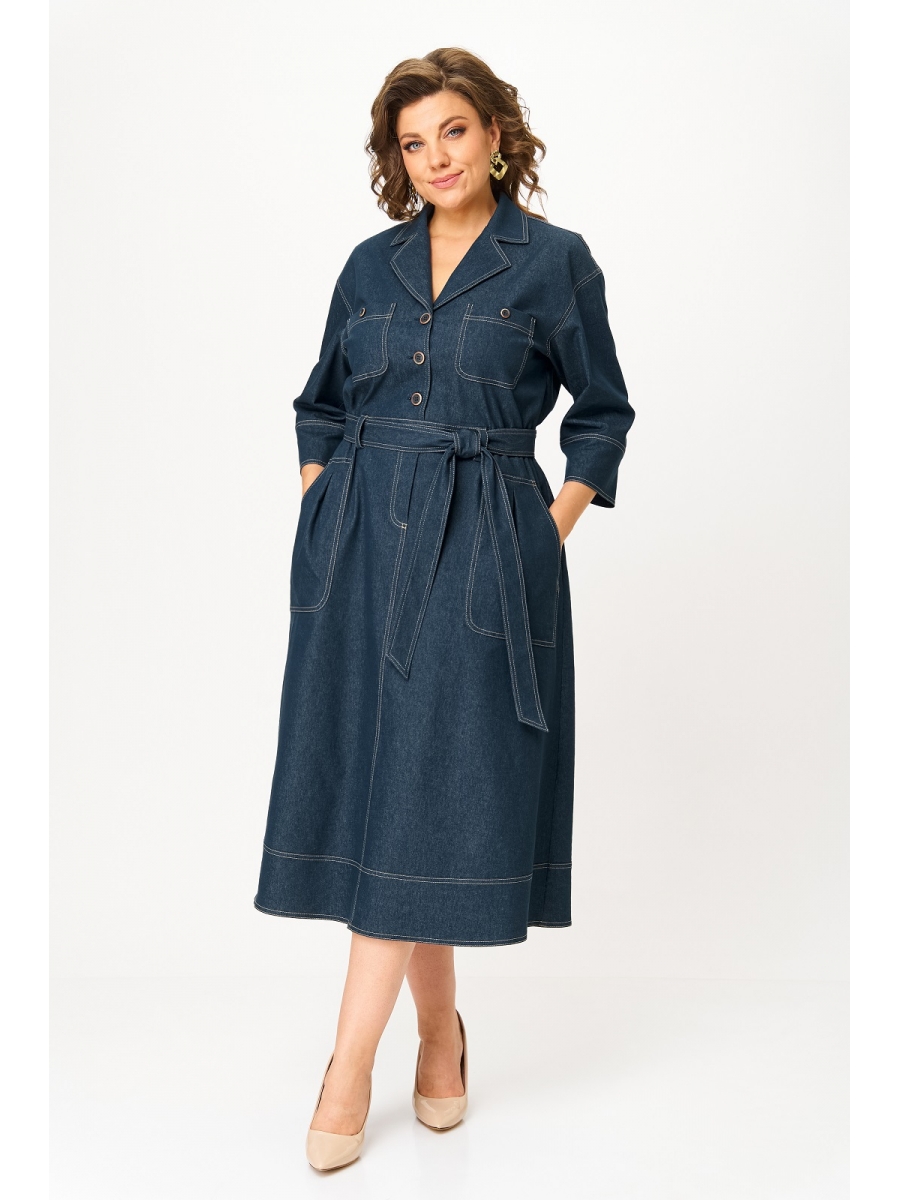 Оформить заказ →Современное элегантное женское платье из плательной джинсовой ткани. Удлиненное, лиф с центральной застежкой до талии на декоративные пуговицы, воротник пиджачного типа, небольшие накладные нагрудные карманы с декоративными пуговицами, линия плеча слегка опущена, рукав 3/4 с притачным манжетом, по спинке отрезная кокетка и декоративная металлическая нашивка, по линии талии отрезной пояс со шлевками для съемного пояса и частично с резинкой, юбка расширена к низу, со средними швами по переду и спинке, с имитацией гульфика и большими накладными карманами со складками, по низу юбки притачная планка. Швы платья отстрочены контрастной гарусной нитью.