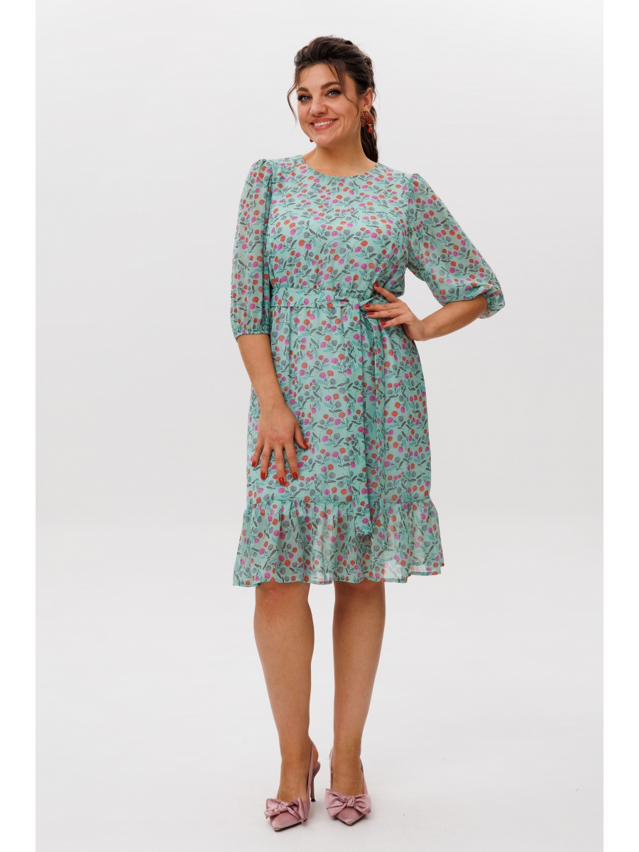 Это платье «мятная феерия» — воплощение элегантности и романтики. Сшитое из лёгкого шифона с нежным цветочным принтом, оно создаёт воздушный и женственный образ. Прямой крой с изящным воланом по подолу придаёт силуэту мягкую динамику, а резинка по талии подчёркивает фигуру, сохраняя удобство. Рукав со сборкой и изысканным манжетом на пуговице добавляет утончённости, а округлая горловина подчёркивает нежность черт лица. Застёжка на спинке с петлёй и пуговицей обеспечивает комфорт, а съёмный пояс позволяет создать акцент на талии, придавая образу завершённость.