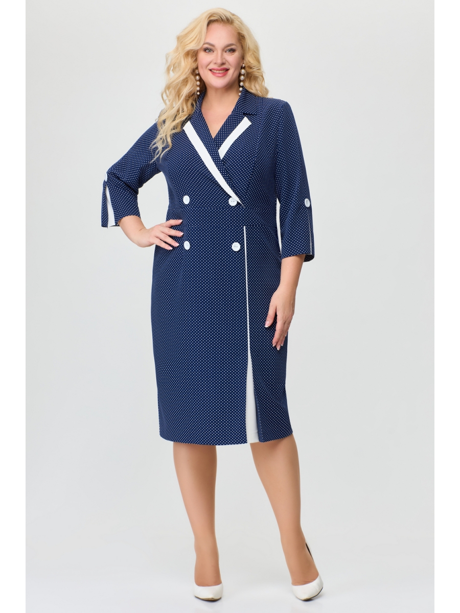 Платье женское полуприлегающего силуэта, с имитацией двубортной застежки, с пиджачным воротником. Перед отрезной по линии талии. Верхняя часть с рельефами от плечевого шва, нижняя часть с талиевыми вытачками, встречной складкой. Спинка со средним швом, по низу шлица. Рукав втачной, длиной ¾, из двух частей по низу встречная складка.