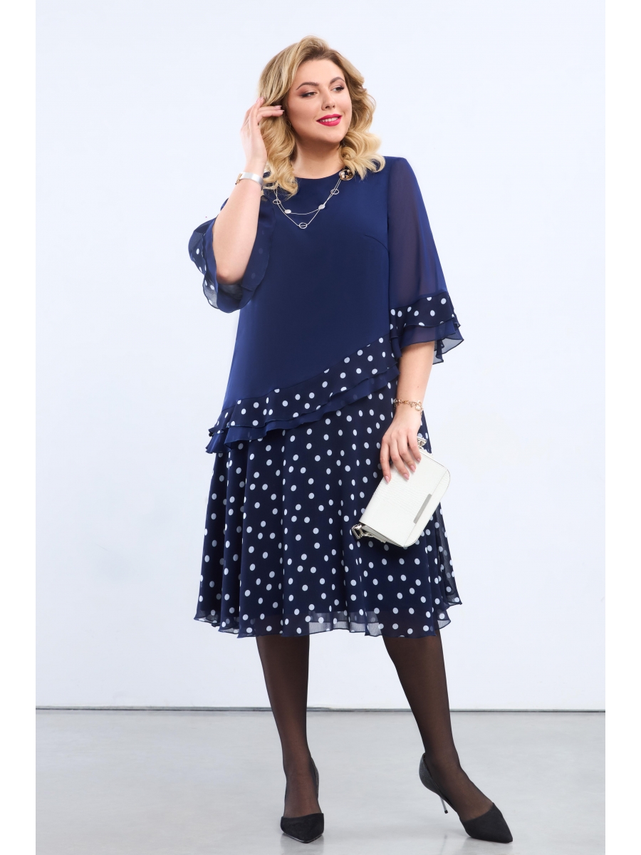 Женское платье, выполненное из струящегося шифона, на сочетании однотона и дизайна. Платье имитирует расширенную к низу блузку и расширенную к низу юбку. Линия низа верхней части платья косая, и оформлена двойным воланом, один из которых выполнен из дизайна, а второй однотонный. Юбка также выполнена из дизайна, а верхняя часть и рукава из однотонного шифона. Рукава втачные, расширенные к низу. По низу рукавов также двойные воланы. Вырез горловины округлый. Изделие на подкладке. Декором служит съемная брошь. Платье на подкладке.