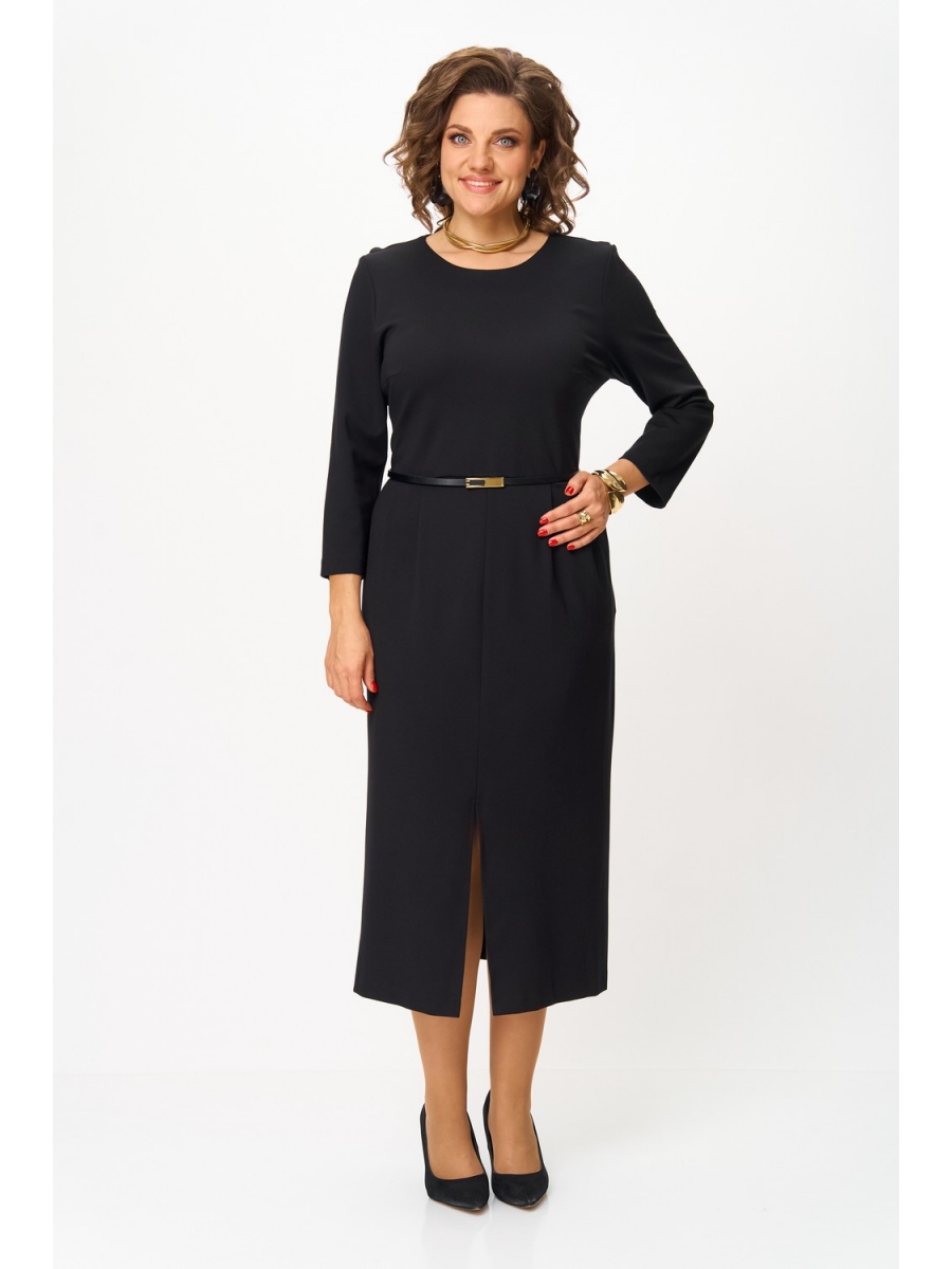 Платье женское полуприлегающего силуэта с втачным рукавом. Перед платья с горизонтальным эластичным швом по талии. Верхняя часть с вытачками по линии груди, нижняя часть со складками в области талии и карманами что обеспечивает прекрасную посадку и подчеркивает фигуру. Рукав длиной 7/8. Высокие разрезы по бокам и переду платья добавляют удобства.