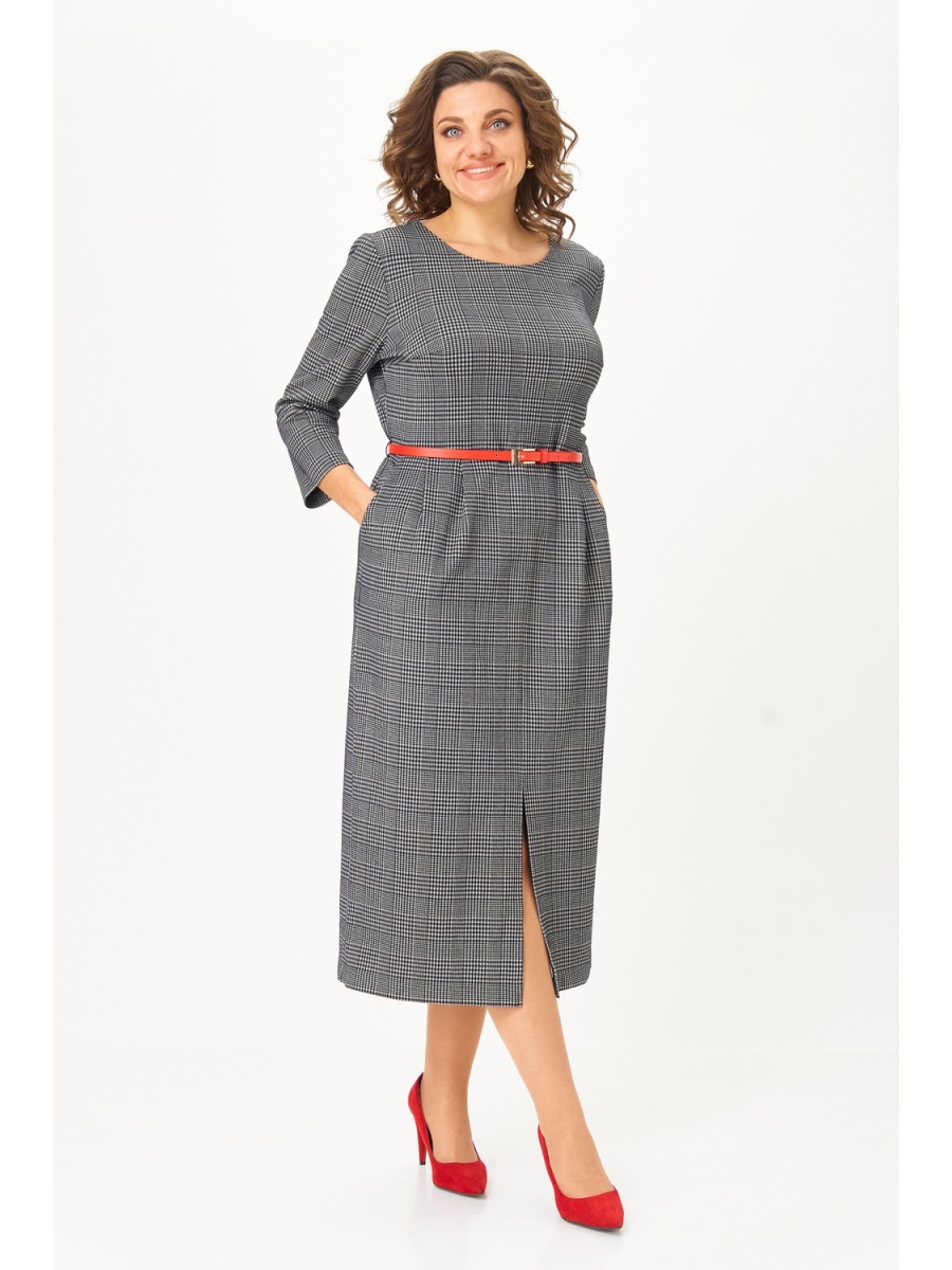 Платье женское полуприлегающего силуэта с втачным рукавом. Перед платья с горизонтальным эластичным швом по талии. Верхняя часть с вытачками по линии груди, нижняя часть со складками в области талии и карманами что обеспечивает прекрасную посадку и подчеркивает фигуру. Рукав длиной 7/8. Высокие разрезы по бокам и переду платья добавляют удобства.
