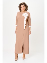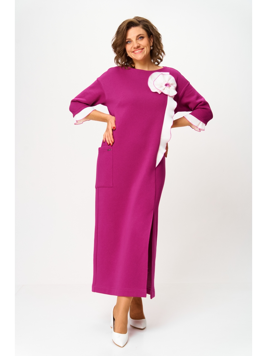 Модель выполнена в прямом, полуприлегающем силуэте с эффектом спущенного плеча, что придает образу легкую непринужденность и женственность. Рукав втачной, одношовный длиной 3/4 с отделочной манжетой из подгибки — практичный и элегантный элемент. Круглый вырез горловины подчеркивает линию шеи и обеспечивает комфорт при носке. Спинка цельная, а передняя часть украшена нагрудными вытачками и левым рельефом с разрезом внизу. В рельеф вставлен декоративный волан-цветок из отделочной плиссировки, который служит ярким акцентом и добавляет модели оригинальности. Длина платья — 7/8, что делает его универсальным для различных сезонов и ситуаций. По правой стороне расположен накладной карман — практичный элемент, дополняющий дизайн и удобство.