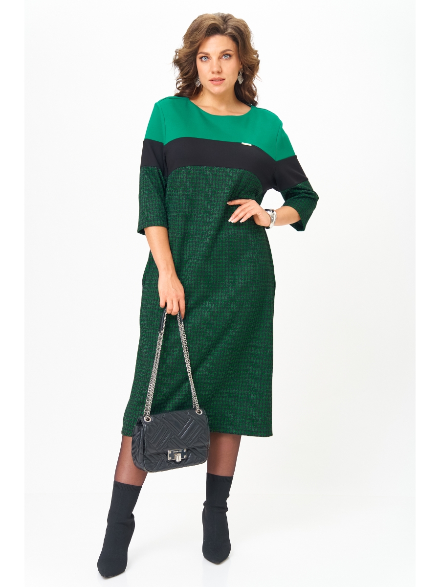 Контрастное сочетание оттенков — черно-зеленый принт, благородный чёрный и освежающий светло-зеленый у линии плеч — визуально делает образ ярче, моложе и эффектнее.