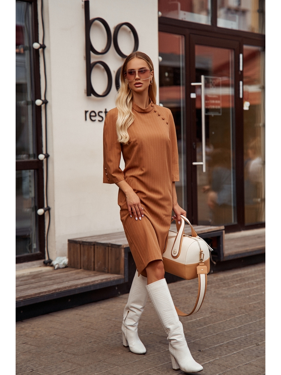 Платье полуприлегающего силуэта, выполнено из плательной ткани, на подкладке. Застёжка на потайную тесьму-молнию в среднем шве спинки, по низу шлица 25 см. Рукав реглан к низу расширен (по низу 40 см). По горловине стойка 3 см. Спереди прорезные карманы и декоративные пуговицы по пройме. В комплекте пояс.