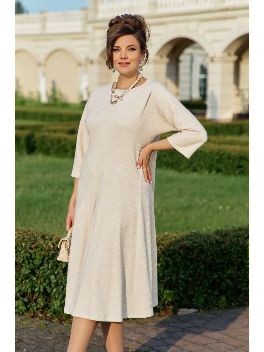 Платье выполнено из высококачественного трикотажа в рубчик, известного как "лапша", это платье обеспечивает приятные тактильные ощущения и отличную посадку по фигуре. Силуэт "клеш" от талии деликатно ниспадает, создавая летящую, женственную форму, которая подчеркивает достоинства фигуры и дарит свободу движений. Горловина округлой формы, оформлена бейкой. По переду платья фигурные подрезы, позволяющие полоске в платье ложиться в разных направлениях создавая интересный образ; у плеча декоративная заложенная складка. Рукав в платье цельнокроеный. Длина миди и рукава три четверти придают платью утонченный и завершенный вид.