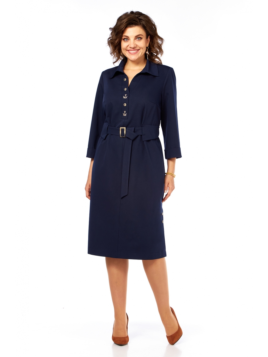 Платье женское прямого силуэта, изготовлено из плательной ткани. По переду нагрудные вытачки и фигурные подрезы с карманами в швах. Горловина оформлена планками с декоративной вышивкой и пуговицами, воротник стояче-отложной. На талии декоративные шлевки и съемный пояс с пряжкой. По спинке кокетка и средний шов. В боковых швах внизу обработаны шлицы декорированы пуговицами.