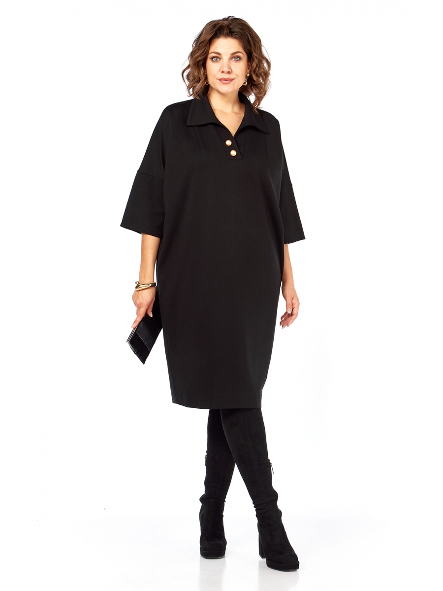 Платье женское, свободного кроя, изготовлено из трикотажного полотна. Горловина обработана стояче-отложным воротником и планками, декорированными пуговицами. Спинка со средним швом. Рукава спущенные, длиной ¾.