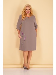 Нарядное платье А-силуэта, выполненное из стрейчевой плательно-костюмной ткани. Перед платья с нагрудными вытачками. Горловина округлая, украшена фигурным вырезом – капелька. Спинка со средним швом. В боковых швах обработаны функциональные карманы. Рукав втачной одношовный, низ рукава обработан фигурной манжетой. Ярким акцентом служит вышивка – стилизованная ветвь лаванды. В качестве отделки используются пришивные стразы на вырезе горловины и рукавах(фурнитура может отличаться от представленной на фото).