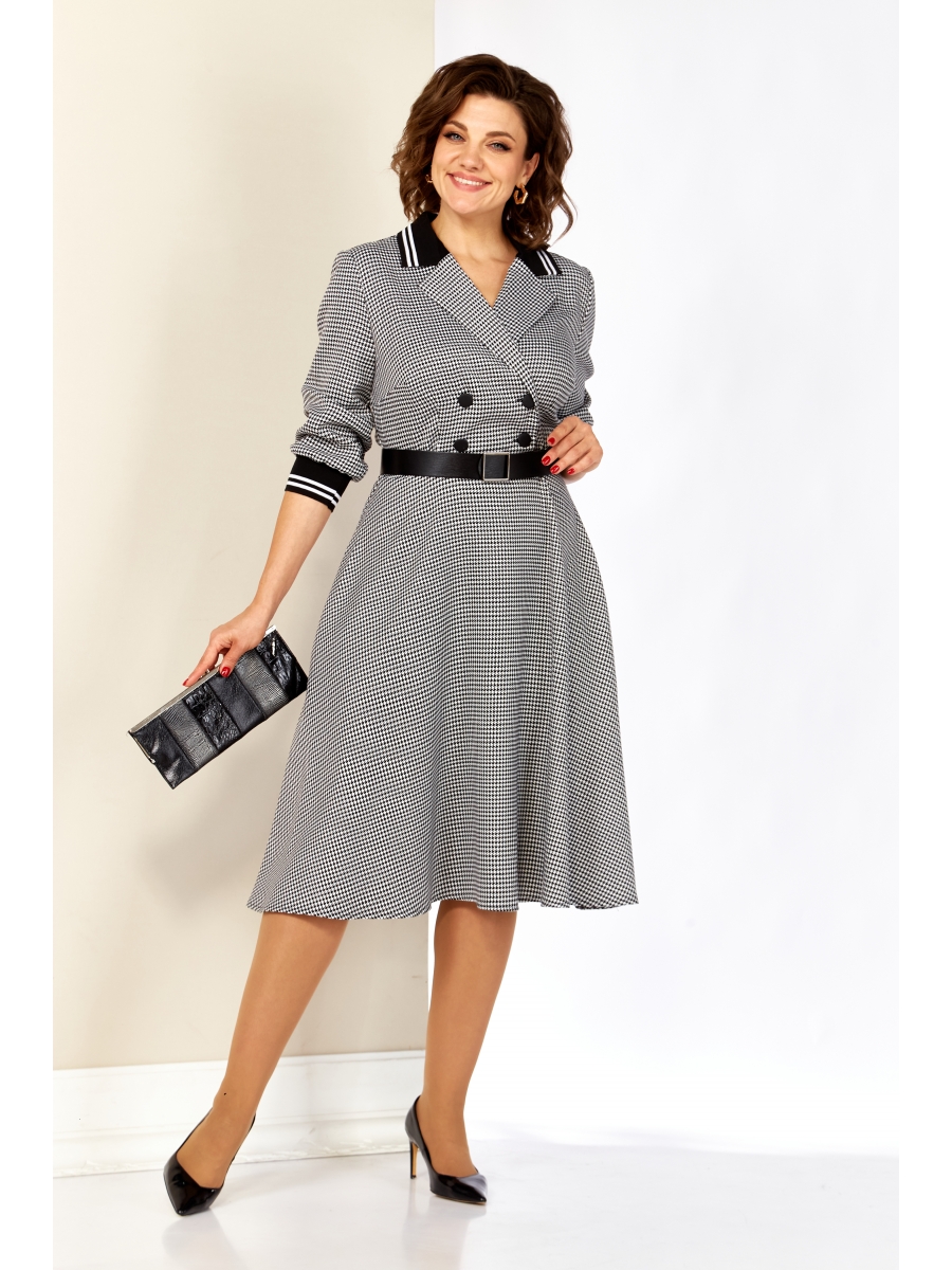 Женское элегантное классическое платье из костюмно-плательной ткани с рисунком «Гусиная лапка». Платье полу прилегающего силуэта, отрезное по линии талии, расклешенное к низу. Лиф переда с двубортной застежкой и нагрудными вытачками, выходящими из боковых швов. Спинка с талиевыми вытачками по лифу. В боковых швах платья расположены только карманы, застежки на потайной молнии не будет! Воротник отложной. Современная модель с рукавам ¾ на манжетах, выполненных с эластичного материала (резинка-довяз). Платье с идеальной посадкой. Впишется в дресс-код и подойдет для офиса и школы. Поможет создать строгий и стильный образ. Сочетается с жакетами, куртками и пиджаками.