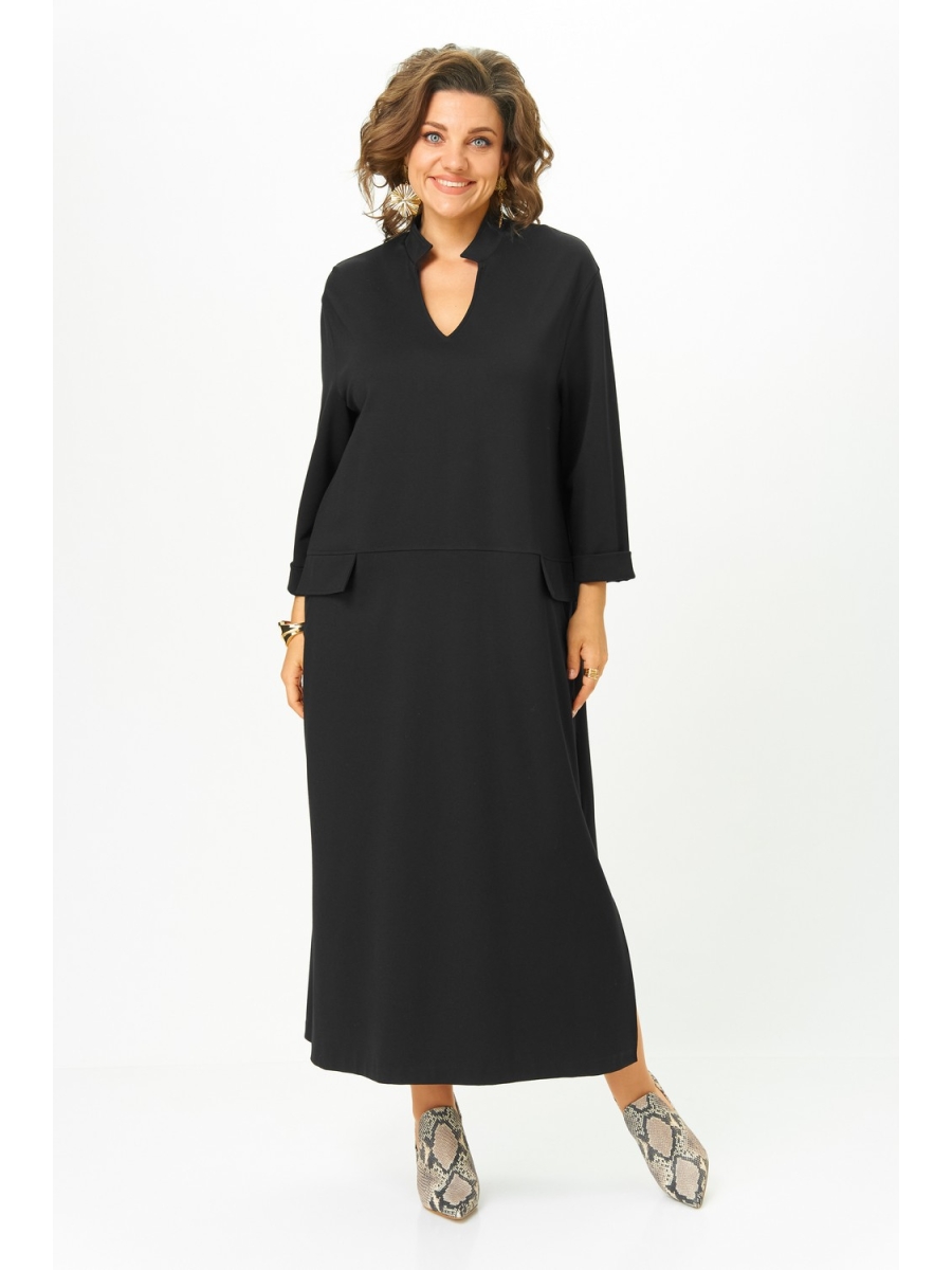 Платье женское прямого силуэта из трикотажного полотна длины миди, станет идеальным выбором для создания стильного и комфортного образа. Линия плеча спущена. Горловина v-образной формы с воротником-стойкой. По переду горизонтальный шов и боковые карманы с клапаном в нижней части. По спинке расположен центральный шов. Втачные рукава длиной 7/8 с отложной манжетой к низу добавляют легкости. В боковых швах обработаны разрезы.