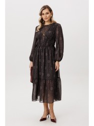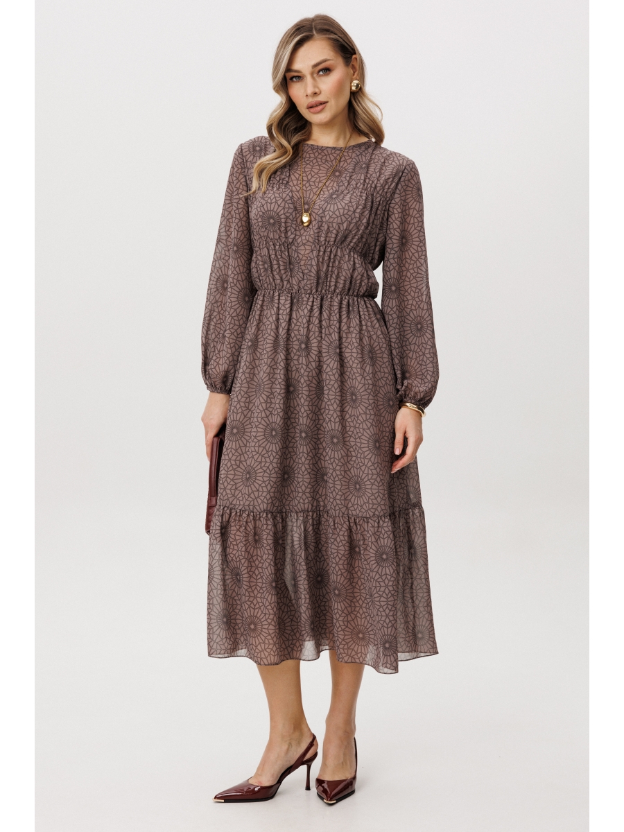 Легкое и воздушное, микс нежности и дерзости, воплощенный в комбинации противоположностей: нежного шифона и геометрического принта. А-образный силуэт, втачной рукав, со сборкой по низу, круглая горловина. Платье отрезное, чуть выше линии талии, лиф полочки с V-образным подрезом и легкой сборкой в боковой части на эластичную венгерку. Боковая часть на подкладке. Лиф спинки со средним швом и застежкой. По линии талии-эластичная тесьма.