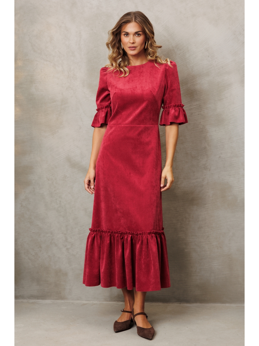 Оформить заказ →Платье приталенного силуэта отрезное по линии талии из мягкой вельветовой ткани. Верхняя часть переда с нагрудной вытачкой. Спинка со средним швом и потайной молнией. Рукав втачной со сборкой по окату. По низу рукава и по низу изделия волан.