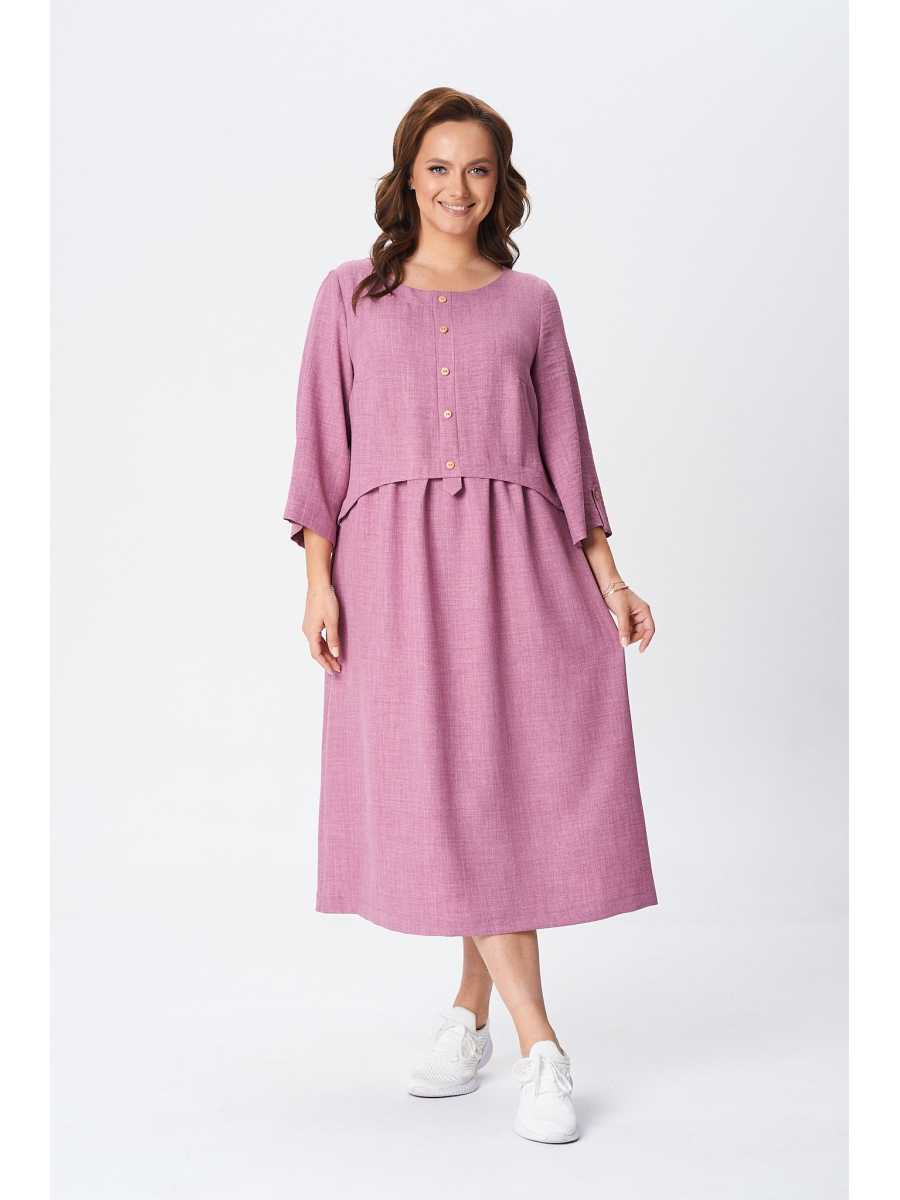 Платье женское свободного покроя в стиле «бохо» из плательной ткани. Лиф переда декорирован планкой с пуговицами; нагрудные вытачки из бокового шва. Горловина округлой формы, обработана обтачкой. В боковых швах функциональные карманы. Спинка со средним швом. Низ лифа обработан обтачкой, линия талии присобрана. Рукав втачной 3/4 с отделочной патой и пуговицей.