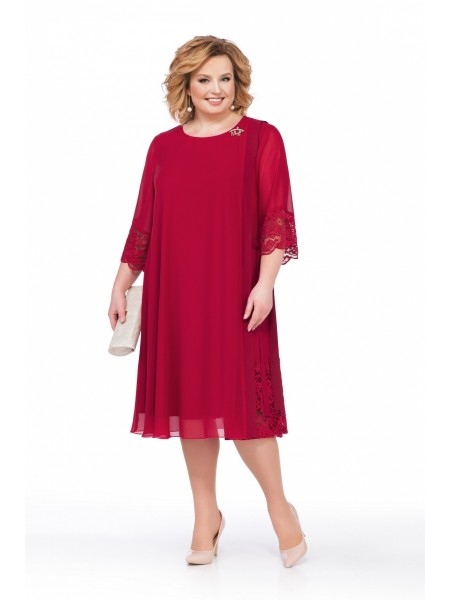 Платье свободного силуэта без застежки из шифона на трикотажной подкладке. Асимметричное оформление переда и спинки с боковыми деталями, отделанными гипюром. Рукава одношовные из шифона с подрезами из гипюра. Подкладка трикотажная. Есть плечевые накладки.